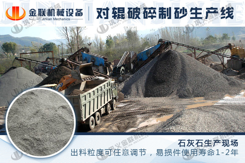 時產100噸對輥破碎機生產現場-石灰石破碎制砂